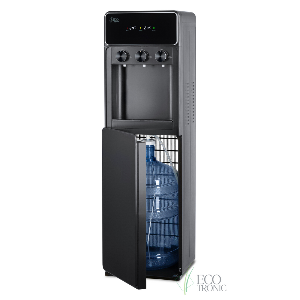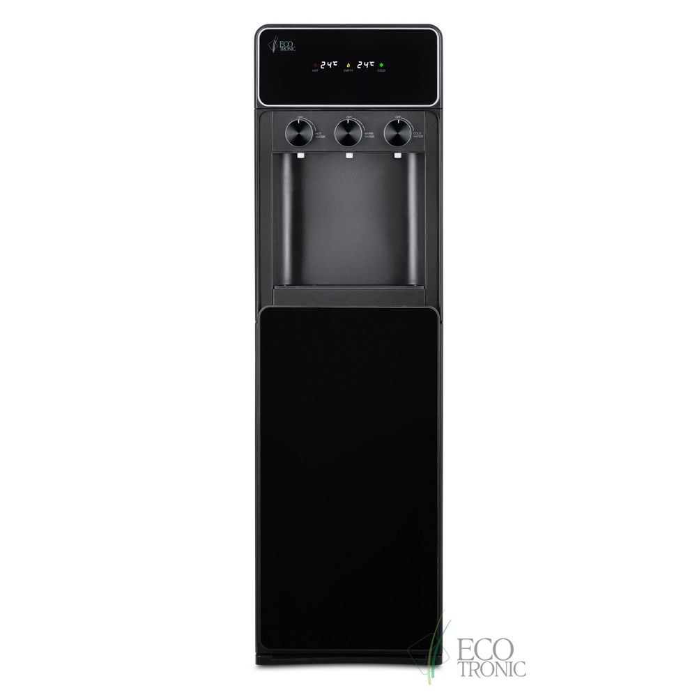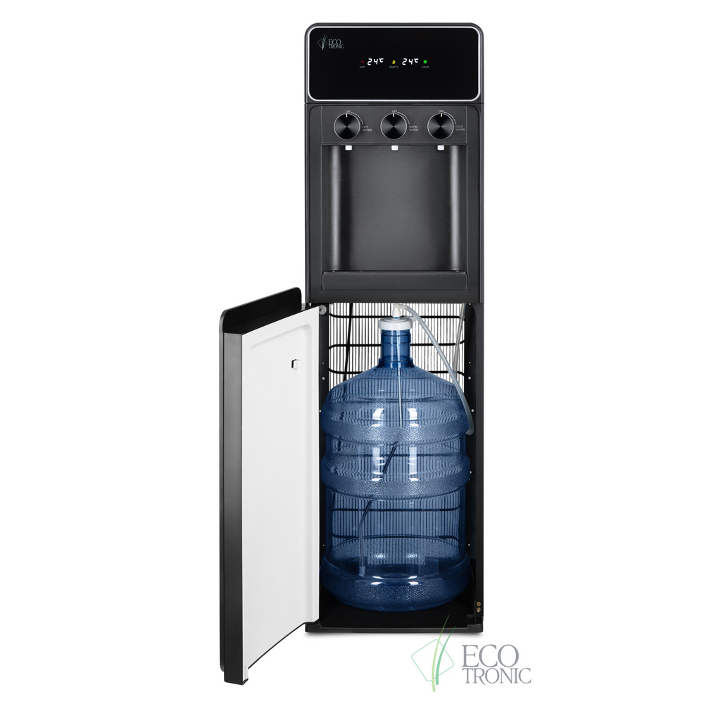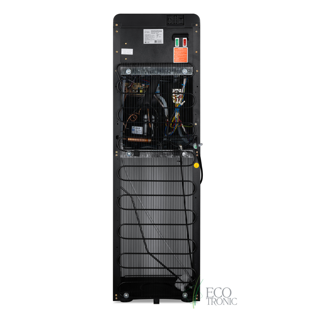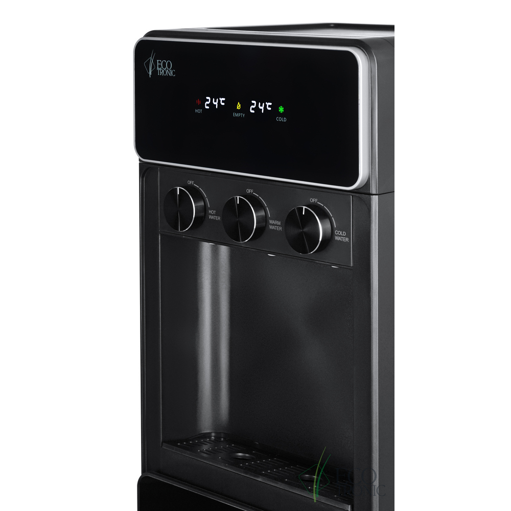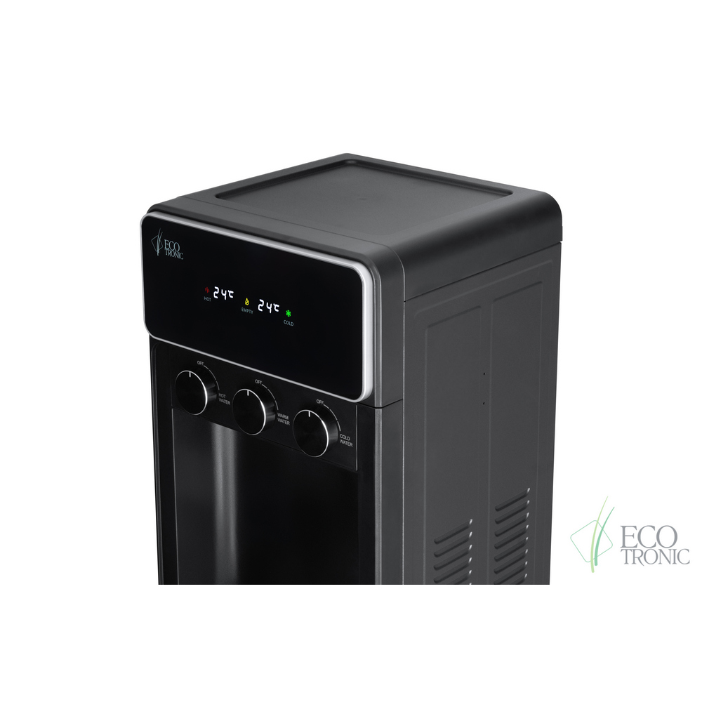 Необычный внешний вид кранов, стильный корпус полностью черного цвета и нижний отсек, в котором полностью скрывается бутыль, позволяют эффектно вписать этот кулер в современный интерьер с продуманным дизайном.