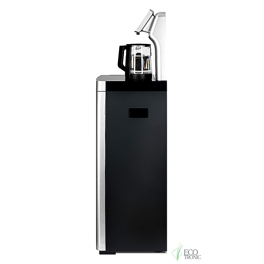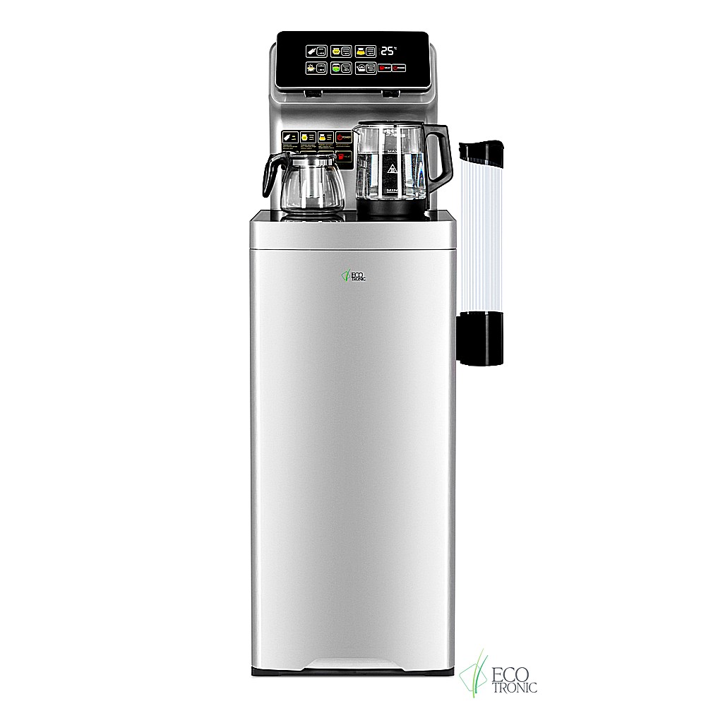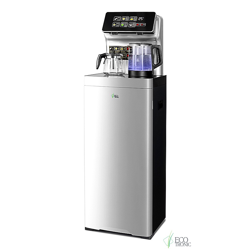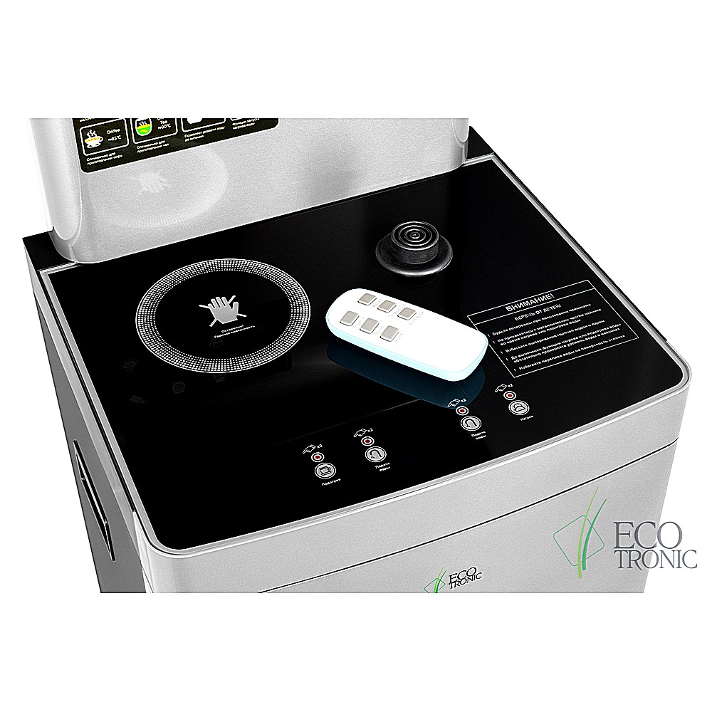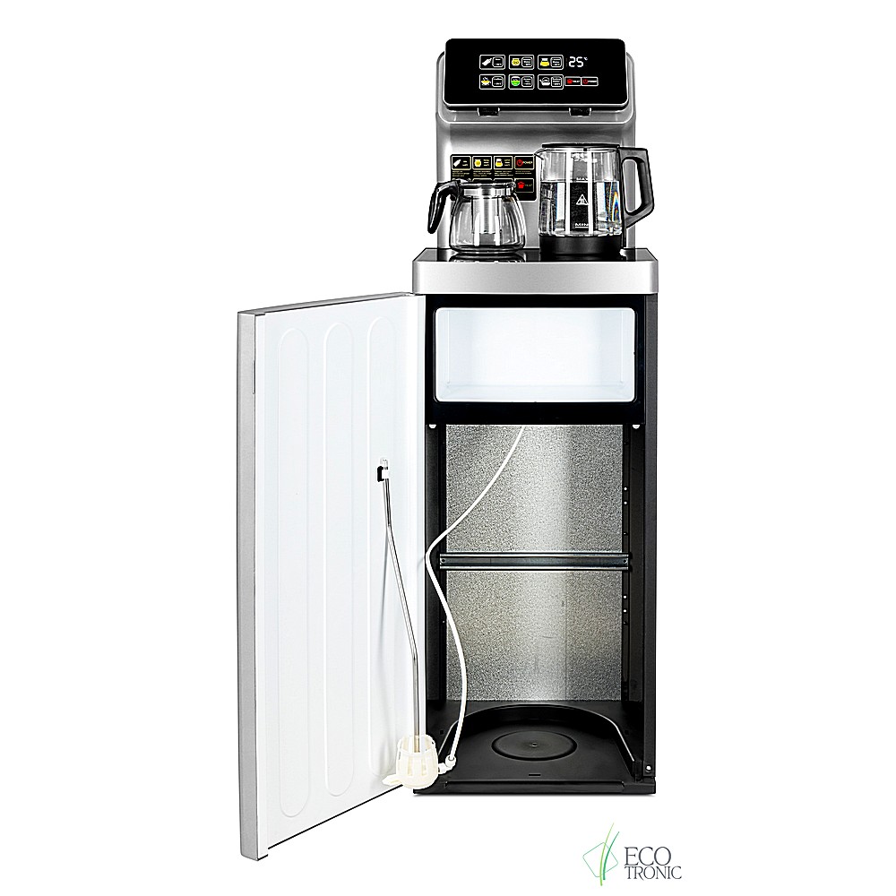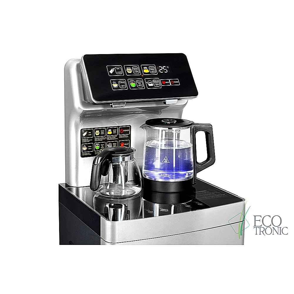 Большая и удобная панель управления с возможностью задать температуру нагрева (6 режимов нагрева). Пульт дистанционного управления. Нижняя загрузка бутыли. Два чайника — для кипячения и заварочный. Без охлаждения, только нагрев. Нагрев воды в чайнике до 100°С. Шкафчик для хранения.